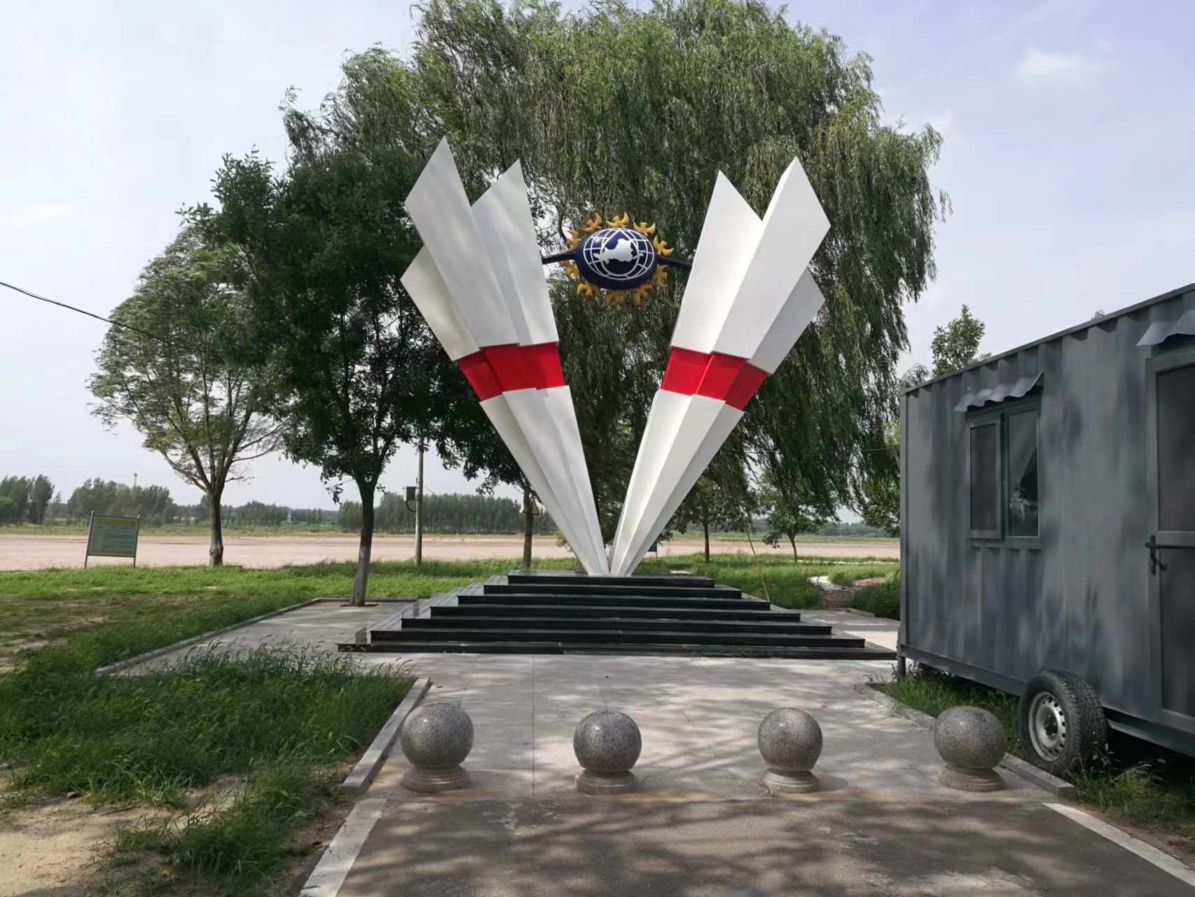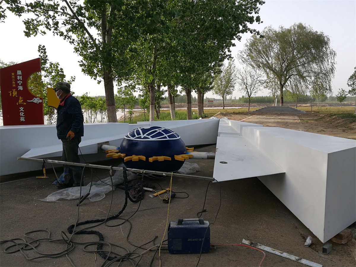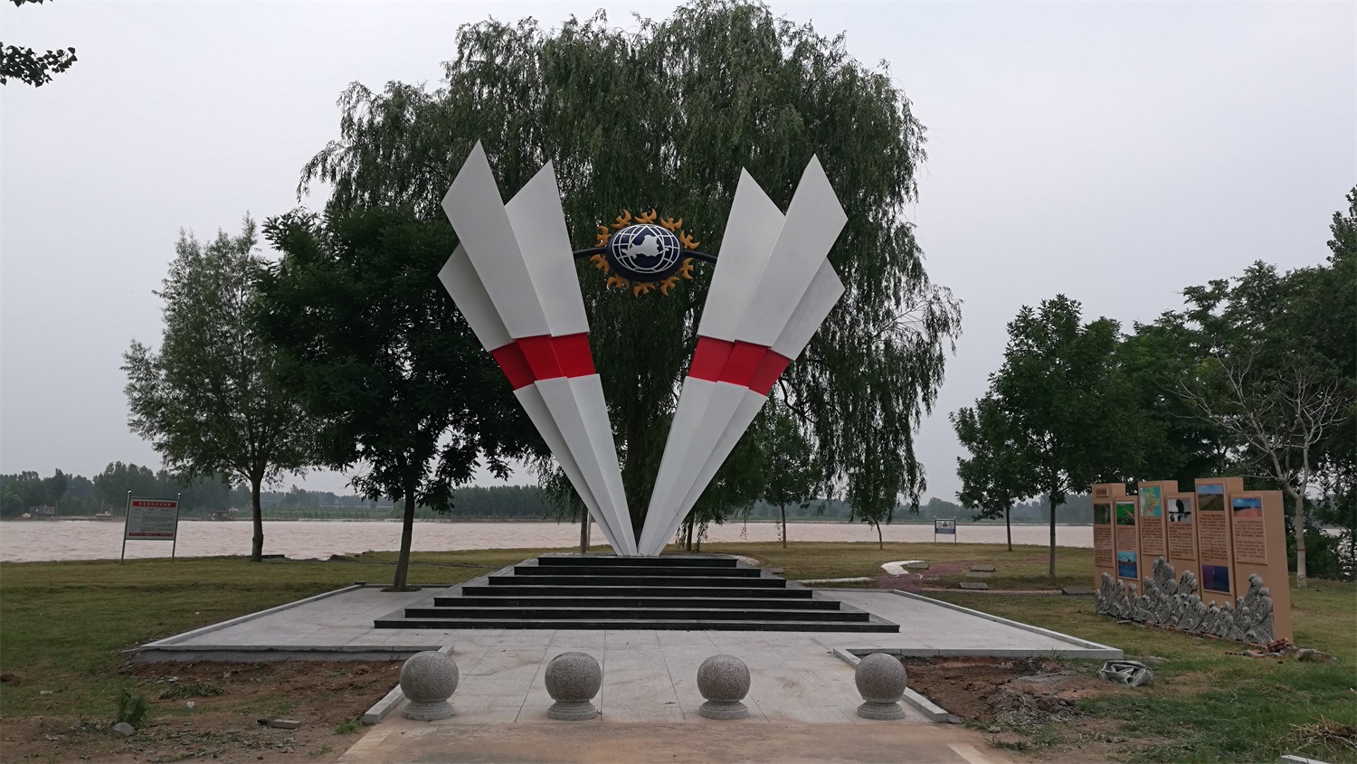 雕塑整體呈扇形構(gòu)造,代表黃河三角洲扇形外貌;兩側(cè)形似利劍,寓意治黃工作者敢于“亮劍”的拼搏精神; 中間球形,寓頂點(diǎn)之意;其上印制有黃河水利委員會(huì)標(biāo)志,圍繞十只和平鴿。寓意以治黃事業(yè)為中心、人民幸福、和平安寧、生態(tài)保護(hù)、空間均衡;主體色彩以紅、黃、藍(lán)搭配。紅色代表黨建引領(lǐng),黃、藍(lán)象征海河交匯。寓意治黃事業(yè)在中國(guó)共產(chǎn)領(lǐng)導(dǎo)下開創(chuàng)新篇章。