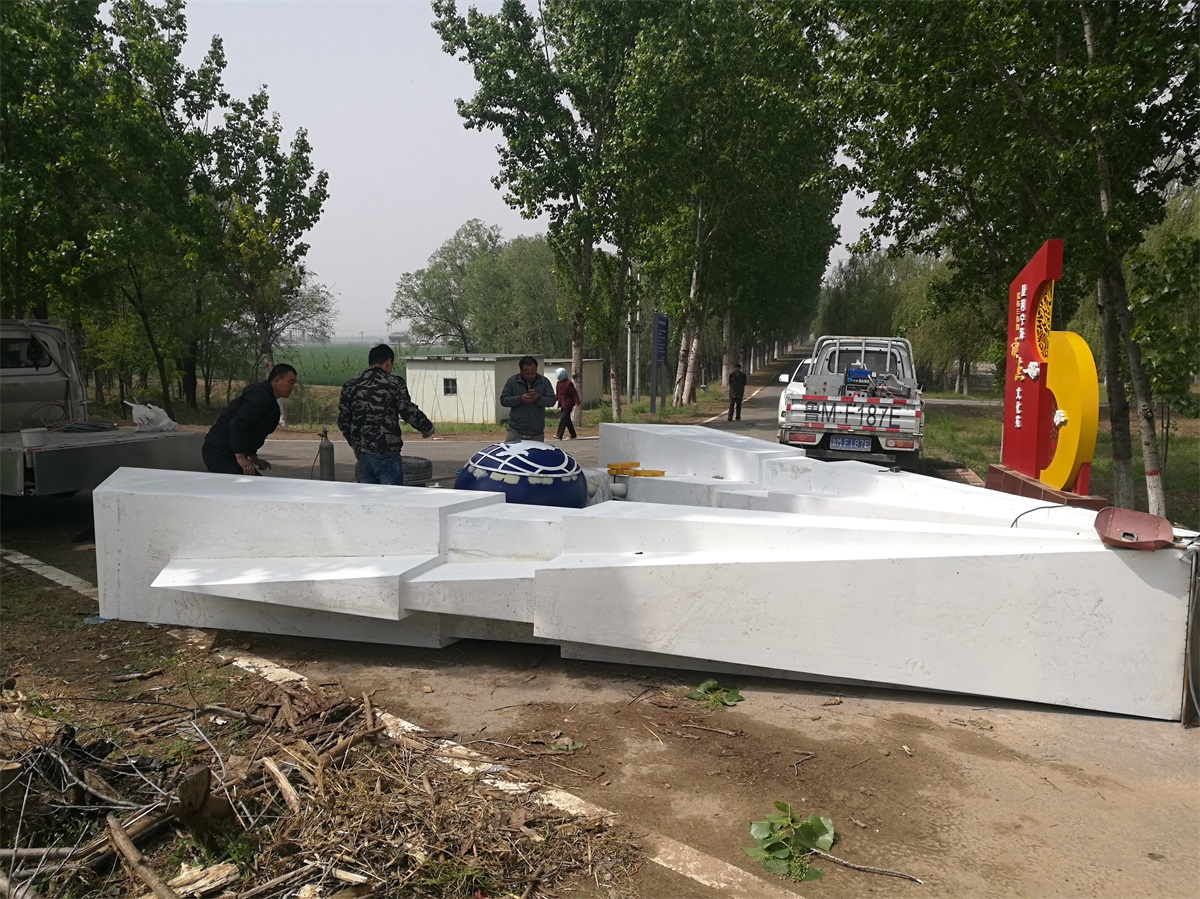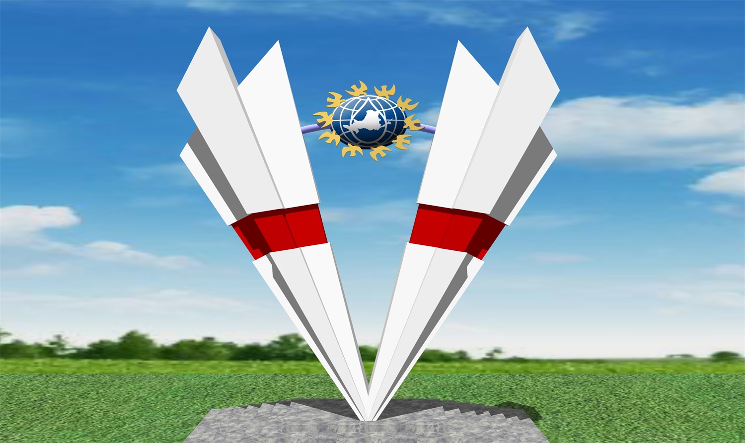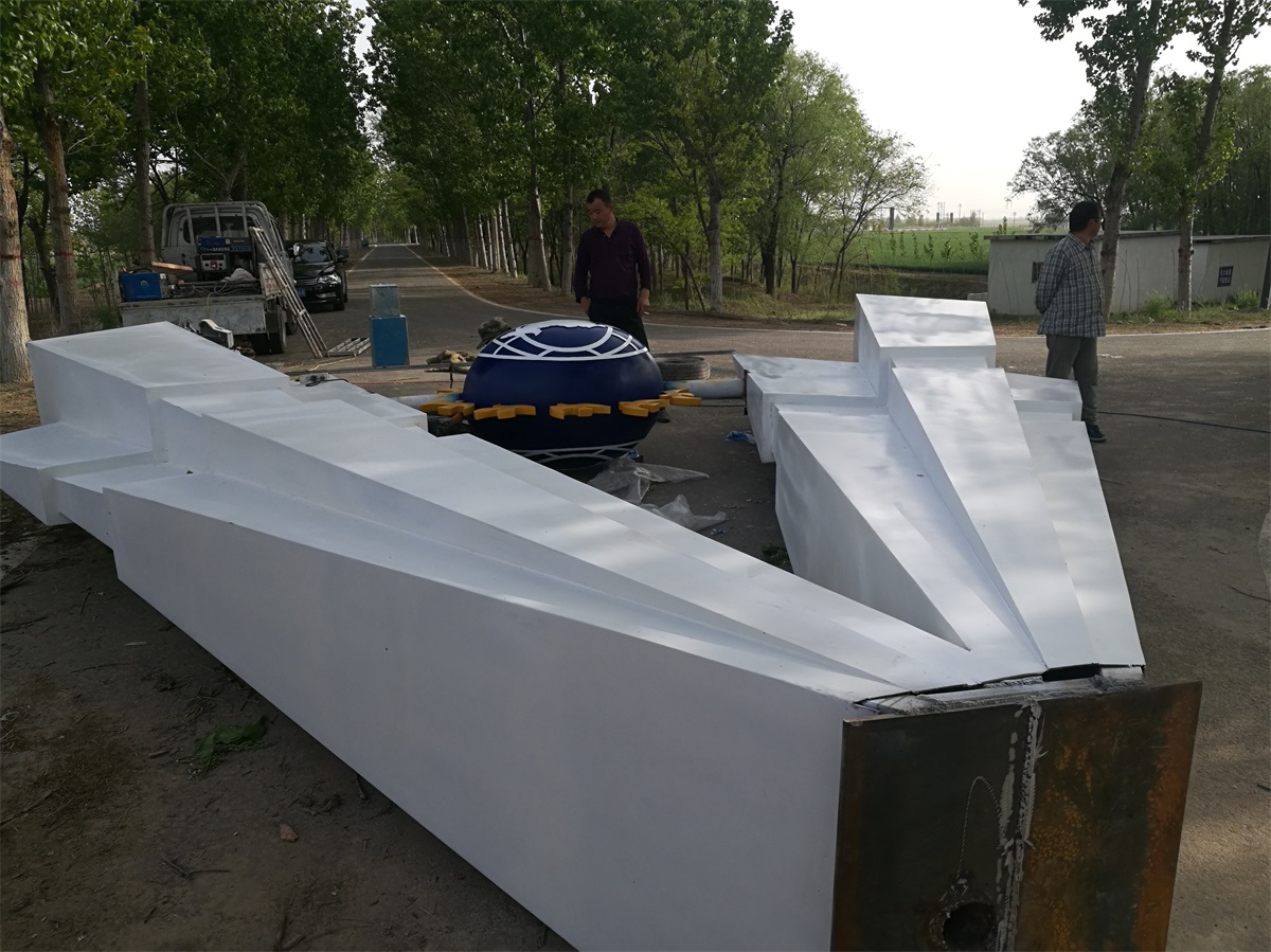 雕塑整體呈扇形構(gòu)造,代表黃河三角洲扇形外貌;兩側(cè)形似利劍,寓意治黃工作者敢于“亮劍”的拼搏精神; 中間球形,寓頂點(diǎn)之意;其上印制有黃河水利委員會(huì)標(biāo)志,圍繞十只和平鴿。寓意以治黃事業(yè)為中心、人民幸福、和平安寧、生態(tài)保護(hù)、空間均衡;主體色彩以紅、黃、藍(lán)搭配。紅色代表黨建引領(lǐng),黃、藍(lán)象征海河交匯。寓意治黃事業(yè)在中國(guó)共產(chǎn)領(lǐng)導(dǎo)下開創(chuàng)新篇章。